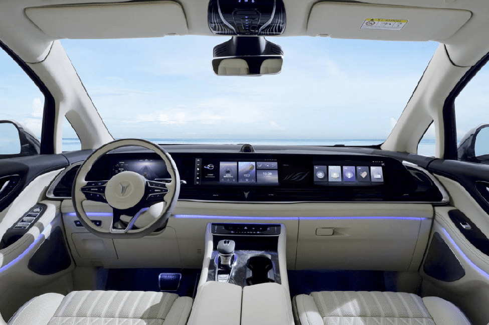 EV/hybrid engine, 7 seats, 4 bags, Chinese luxury van with futuristic tech.